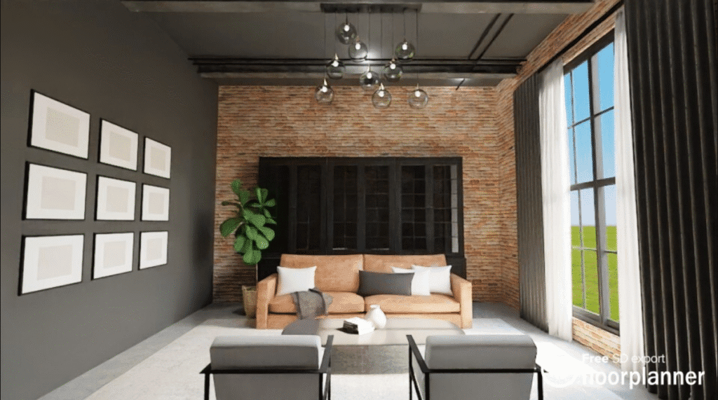 The 3D living room designed by our intern draws inspiration directly from industrial roots. The space emphasizes structural elements rather than concealing them. Exposed brick serves as a focal point, complemented by dark steel beams and black metal pipes along the ceiling. Large factory-style windows fill the room with natural light, and matte black shelving reinforces the industrial aesthetic.