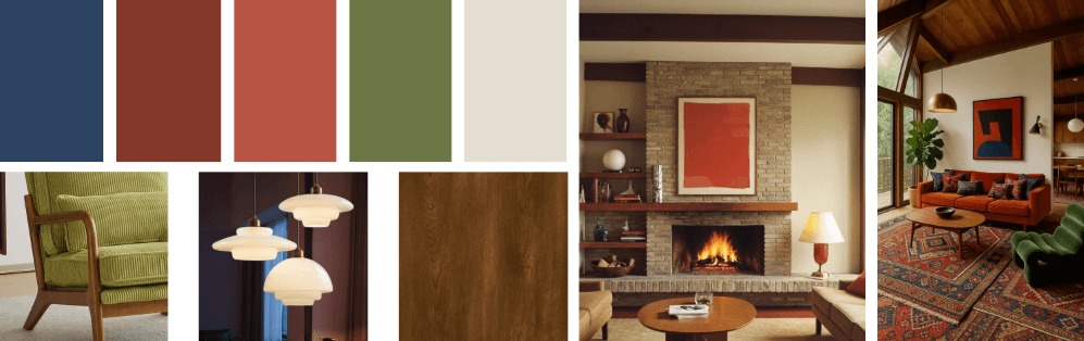 Our intern created a mood board that highlights the key features of mid-century modern design. It combines warm color, architectural detail, and natural texture to create a space that feels inviting and structured.