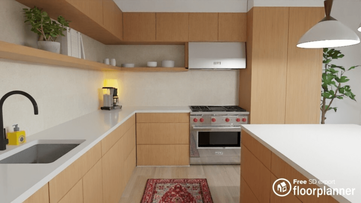 Natural textures, such as wood grain, a woven rug, and small potted plants, bring the outdoors inside. These details add character without overwhelming the space. Pendant lights with curved shapes provide contrast to the straight lines of the cabinetry and countertops. The result is a room that feels open, practical, and full of personality.