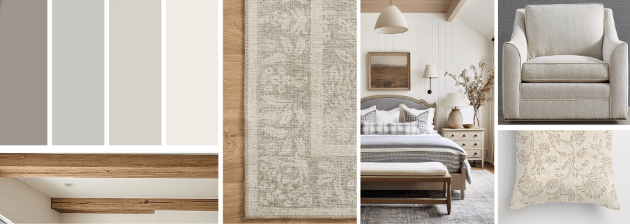 Our intern created a mood board that captures the essence of modern farmhouse interiors. Neutral colors such as cream, beige, and taupe provide a soft and welcoming backdrop, highlighting warm wood tones found in exposed beams, flooring, and furniture. Architectural details such as vaulted ceilings and paneled walls emphasize openness and airiness, which are characteristic of farmhouse living.