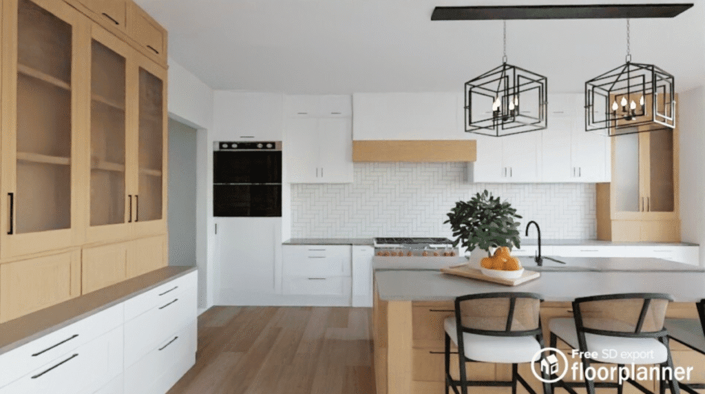 The 3D kitchen designed by our intern embodies modern farmhouse principles by combining rustic materials with contemporary features. The space uses a neutral palette with white cabinetry, wood-toned built-ins, and subtle gray countertops to maintain a light, inviting atmosphere. Organic textures such as wood and woven accents add warmth, contrasting with brighter surfaces for visual interest.