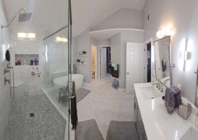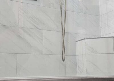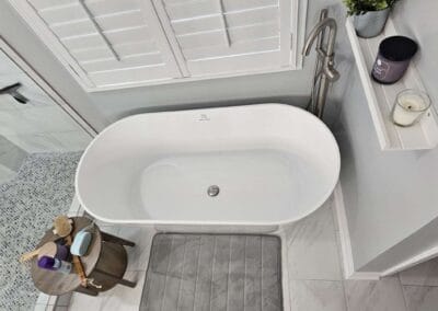 This project focused on a complete master bathroom renovation, combining modern functionality with elegant design. Key updates included the installation of new shower fixtures, a corner seat, and a shower niche with customized tile details. A frameless shower glass enclosure was installed, and the shower area was extended without demolishing walls. The tub area received a stunning transformation, with the installation of a freestanding tub, a freestanding faucet, and tile splash detail around the tub.