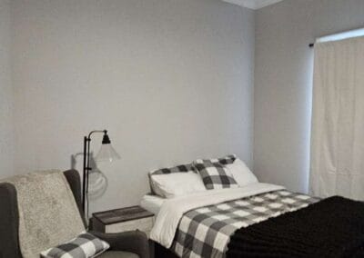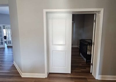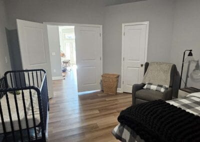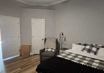 Lighting upgrades were completed to improve functionality, consolidating control from two separate switches into a single switch conveniently located inside the new bedroom. To elevate the room’s aesthetic and accessibility, elegant French doors were installed, adding a touch of sophistication while maintaining an open, airy feel. The result is a beautifully designed space that perfectly complements the adjoining mudroom, blending practicality with refined style.