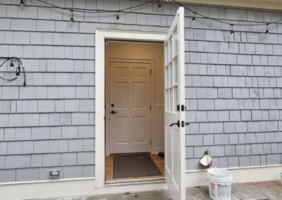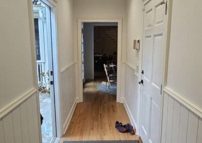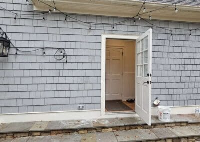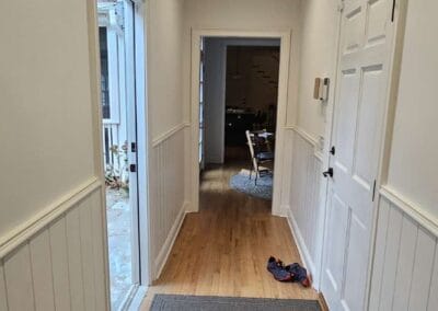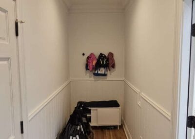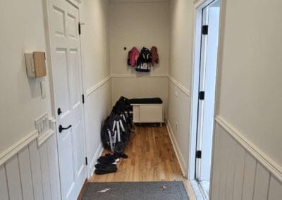 Inside, the new mudroom was expertly finished with matching paint, wainscoting, and trims, ensuring it blended perfectly with the rest of the home’s design. Additional features included the installation of electrical outlets and hangers, enhancing the functionality of the space. The result is a thoughtfully designed mudroom that combines practicality with seamless integration into the home’s existing layout and aesthetic.
