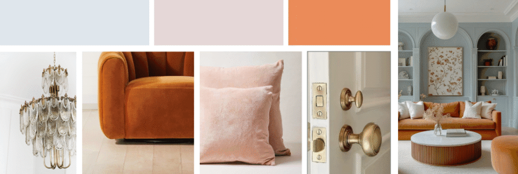 Our intern created a mood board that brings Art Deco principles to life in a modern way. Soft blue and blush tones form a sophisticated base while burnt orange adds warmth and energy. Velvet furniture, sculptural lighting, and brass accents evoke the style of the 1920s and 1930s.