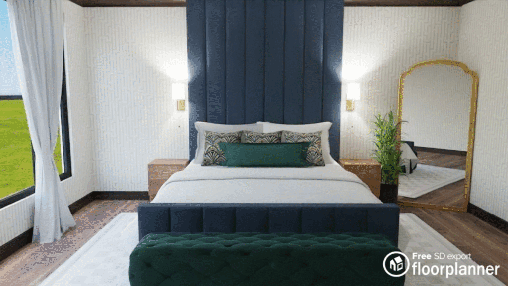 In the 3D bedroom design created by our intern, Art Deco principles are applied to create drama, balance, and luxury. A tall upholstered headboard anchors the room and draws attention to the center of the space. Rich navy and emerald tones contrast with neutral patterned wallpaper, adding depth and sophistication.