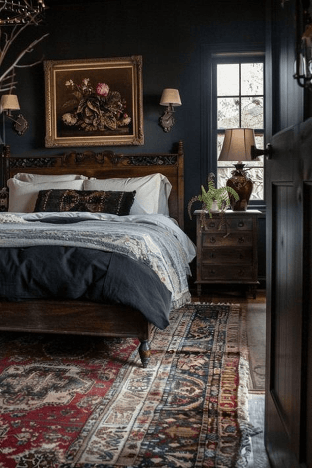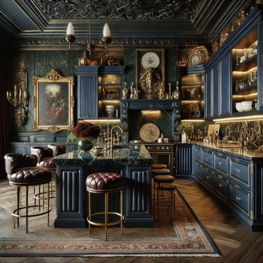 In our home, this style allows us to embrace both comfort and grandeur. For example, our living room features a deep navy velvet sofa layered with patterned silk and wool pillows. Dark wood furniture with carved detailing anchors the space, while brass lighting fixtures and antique mirrors add shimmer and sophistication.